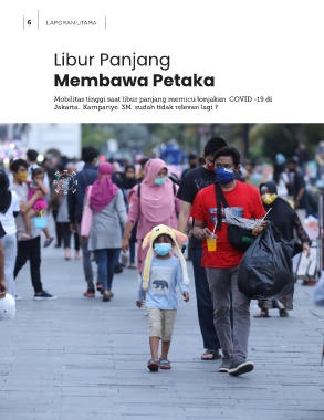 6 LAPORAN UTAMA Libur Panjang Membawa Petaka Mobilitas tinggi saat libur panjang memicu lonjakan COVID -19 di Jakarta. Kampanye 3M sudah tidak relevan lagi ? EDISI 2 TAHUN 2021 Sarana Informasi Pemerintah Provinsi DKI Jakarta
